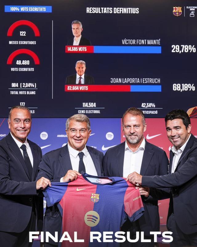 拉波尔塔最终以压倒性优势赢得巴萨主席选举。在约4.8万名会员参与的投票中,拉波尔塔斩获超过68%的选票,较2021年首次当选时的54%大幅提升。在选票核验进度尚不足3/4时,竞争对手丰特便已公开承认败选。